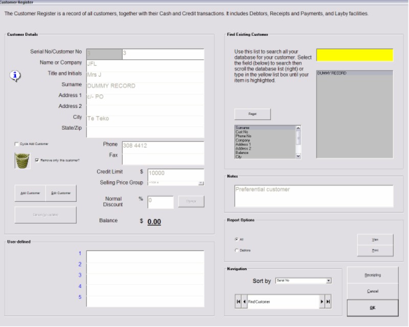 Customer details and transactions are recorded. Similar facility exists for Suppliers. |